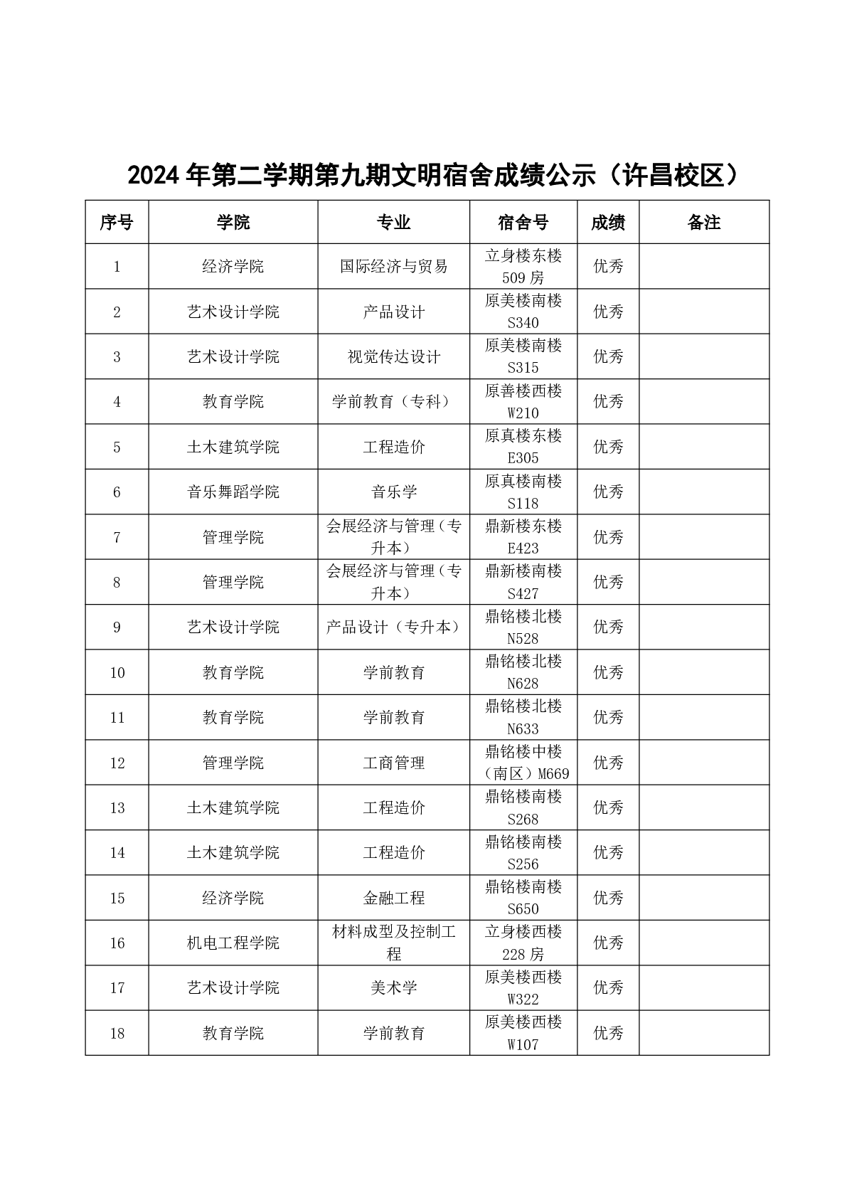 2024年第二学期第九期文明宿舍成绩公示(许昌校区)